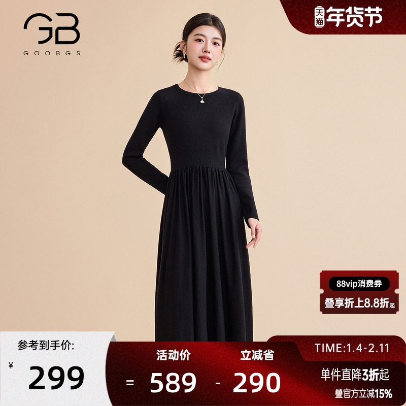 谷邦黑色针织连衣裙女2025冬季新款圆领收腰显瘦修身中长A字裙子