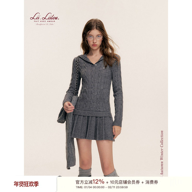 Liilou 缪斯学院系 连帽V领绞花针织口袋收腰A字百褶连衣裙
