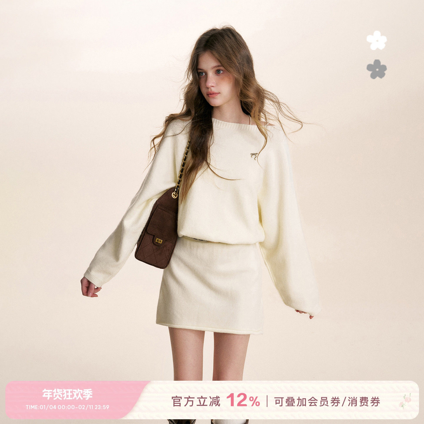 【季末折扣】欧时力 水溶棉V领针织连衣裙收腰A字软糯肌理感秋冬