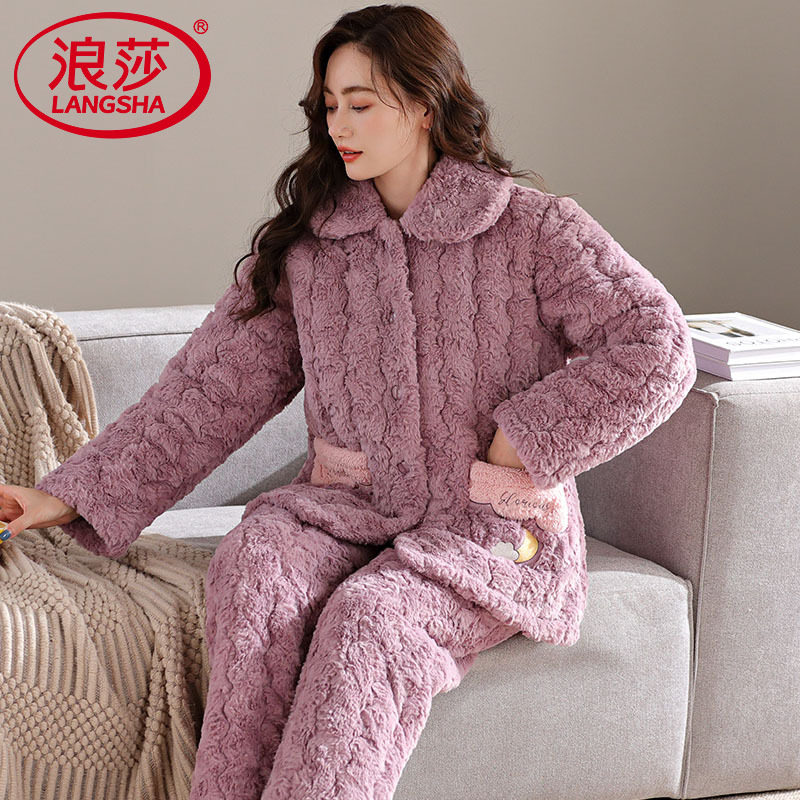 浪莎2025年新款睡衣女冬季加厚珊瑚绒家居服冬天保暖三层夹棉套装
