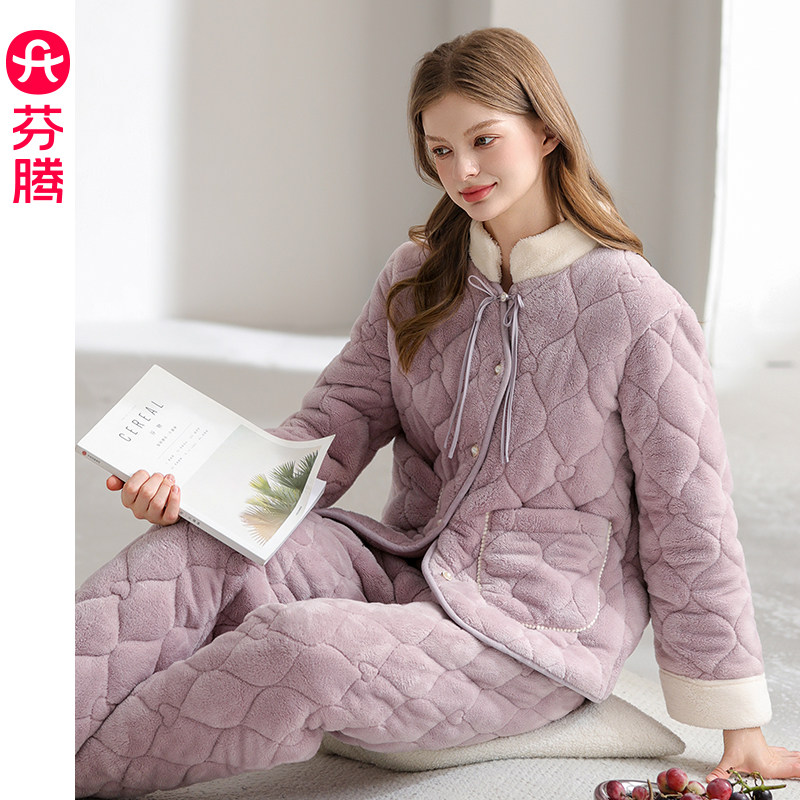 芬腾睡衣女冬季三层加厚珊瑚绒夹棉套装女款加绒抗静电家居服棉袄