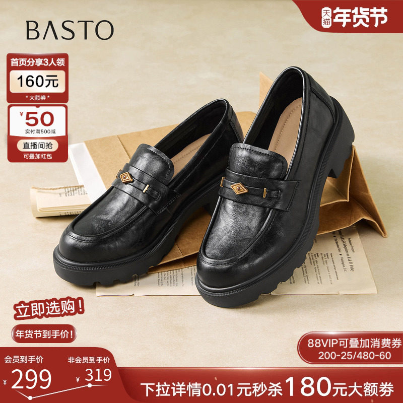 百思图2026春新款英伦风厚底增高粗跟乐福鞋小皮鞋女单鞋UXV08AA6