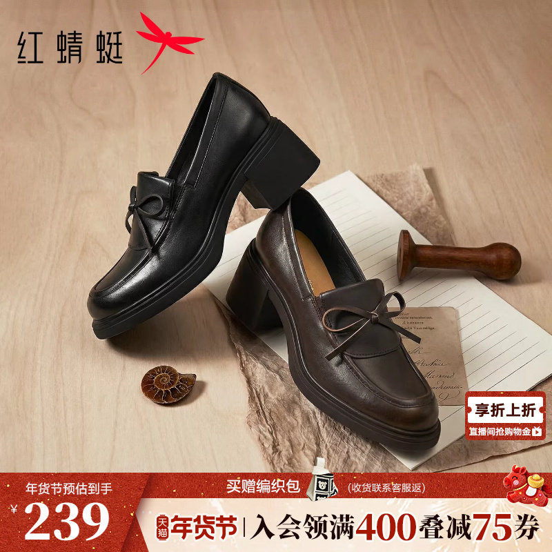 红蜻蜓乐福鞋女2026春季新款女鞋粗跟增高厚底小皮鞋黑色通勤单鞋