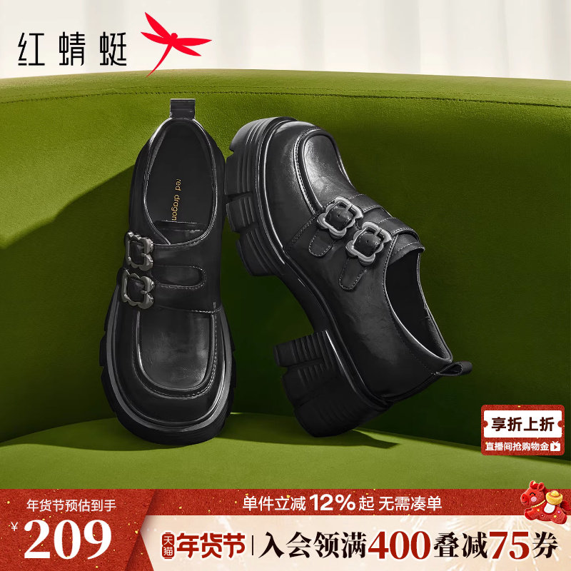 红蜻蜓厚底乐福鞋女春季新款女鞋粗跟增高单鞋学院黑色英伦小皮鞋