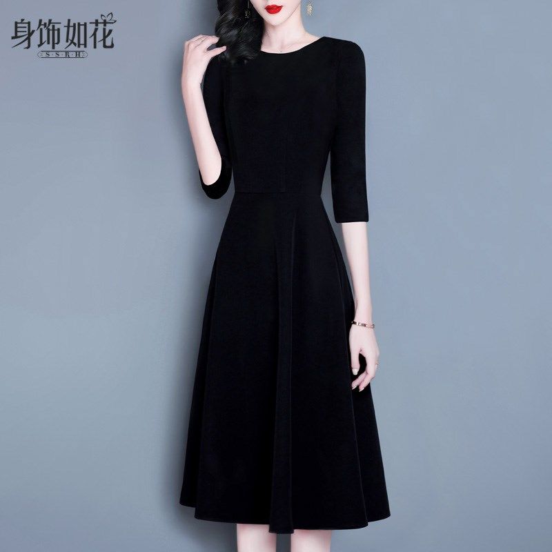 秋冬小黑裙春2025新款气质修身a字裙七分袖中长款黑色打底连衣裙