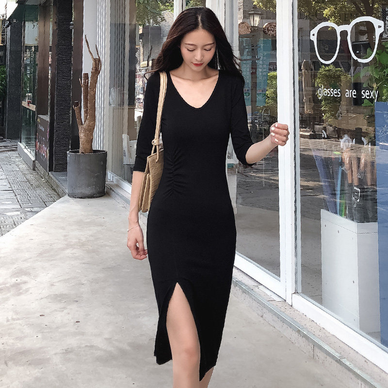 春夏新款侧开叉小黑裙子 V领法式复古过膝中长款黑色打底连衣裙女