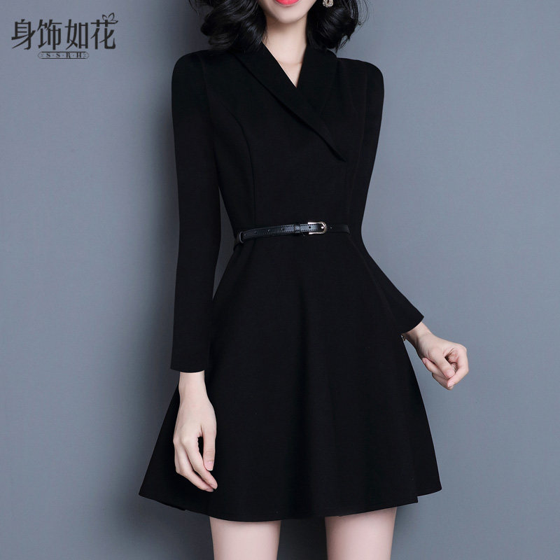 春秋新款大码长袖Polo领黑色打底连衣裙胖mm收腰显瘦遮肉中长裙