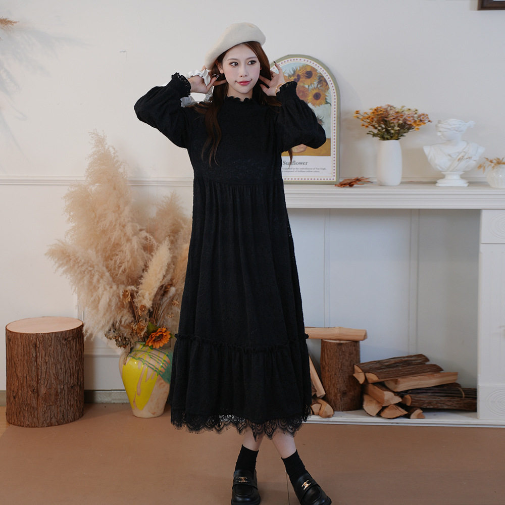 两三事黑色打底连衣裙2025冬季高领小个子蕾丝绒感内搭长裙黑天鹅