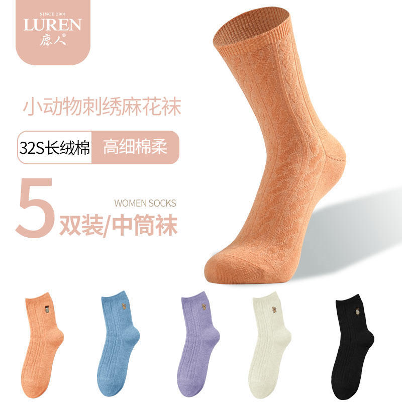鹿人袜子夏季薄款无骨袜女袜中筒休闲运动棉袜学生袜简约提花3012