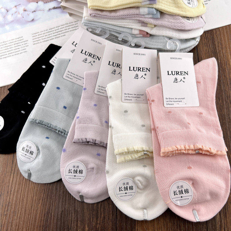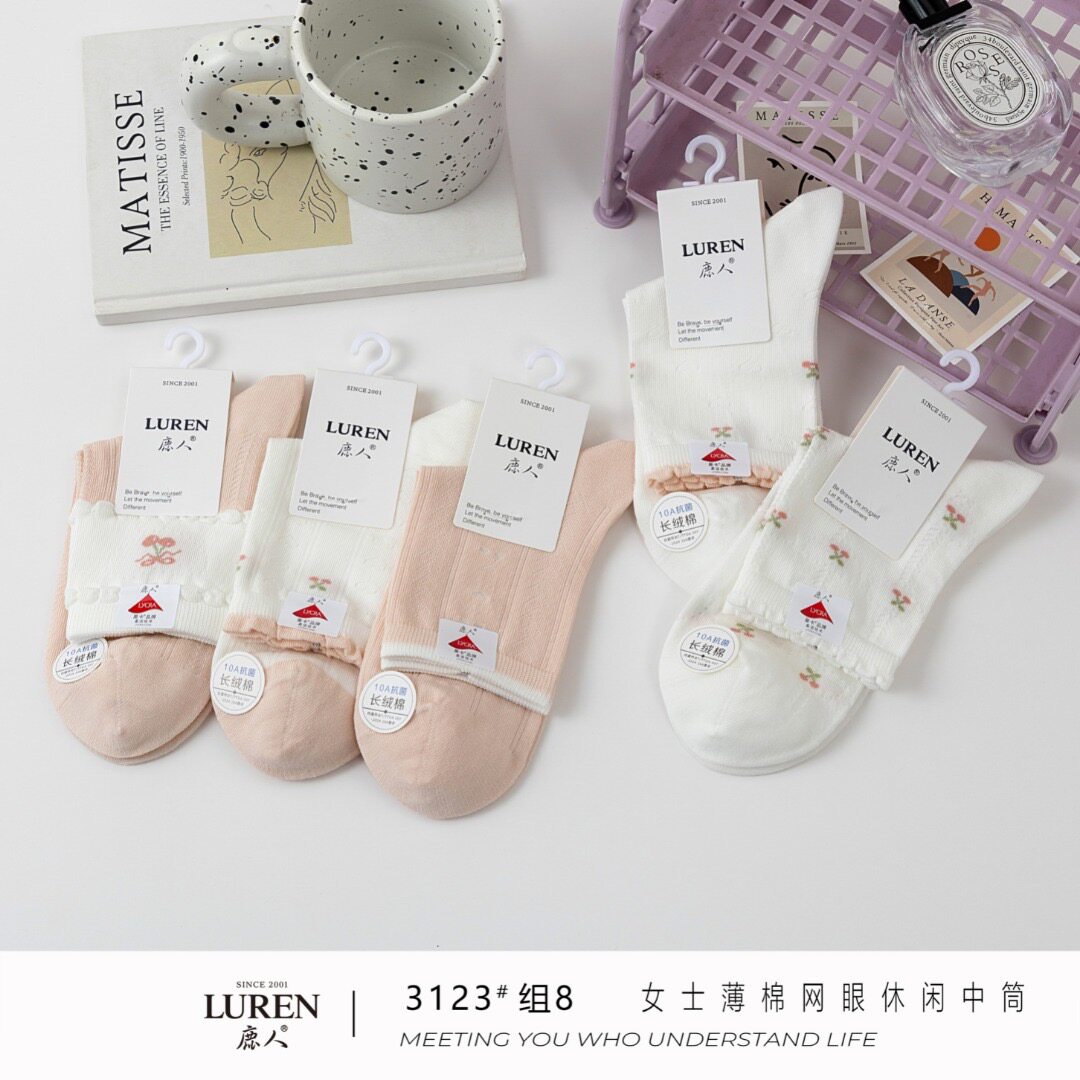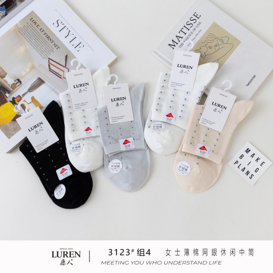 鹿人网眼女袜子春夏纯色棉吸湿排汗简约短中筒卡通舒适女生3123