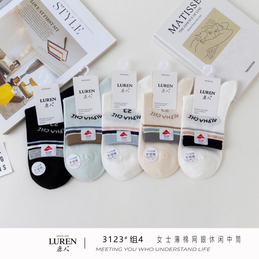 鹿人春夏薄款无骨网眼透气中筒5A长绒棉抗菌女士吸汗条纹字母袜子