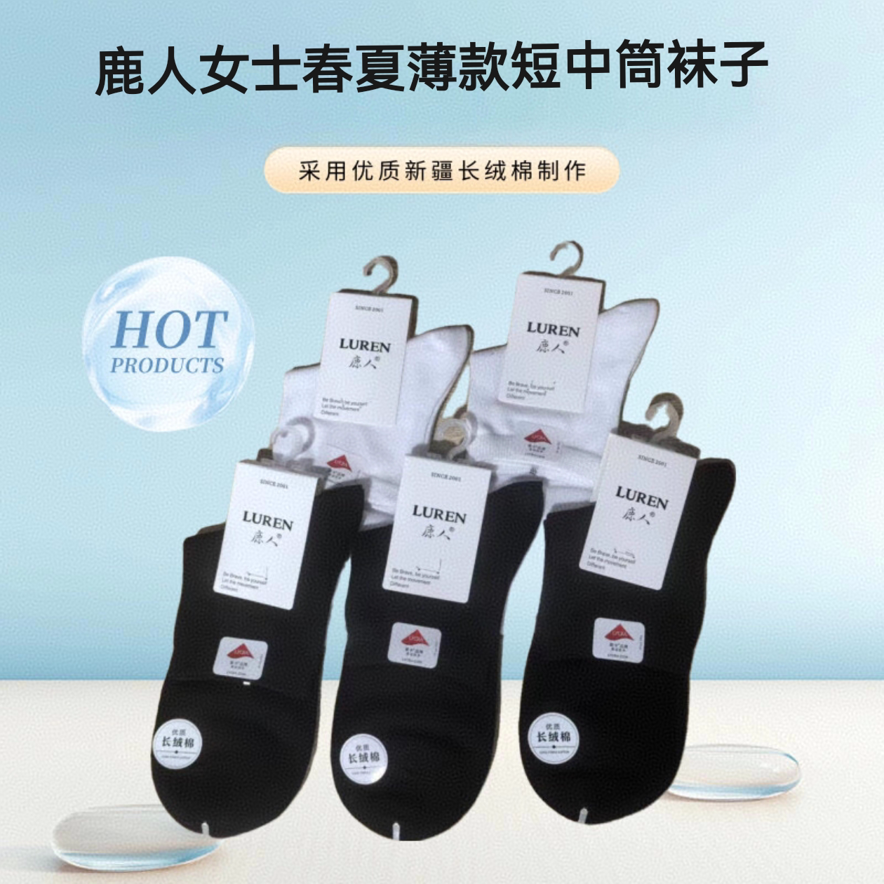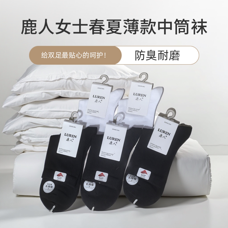 鹿人女士春夏薄款中筒袜子黑白纯色舒适透气吸汗防臭商务无骨耐磨
