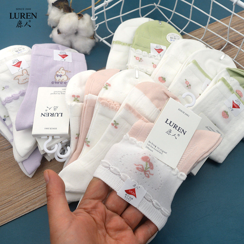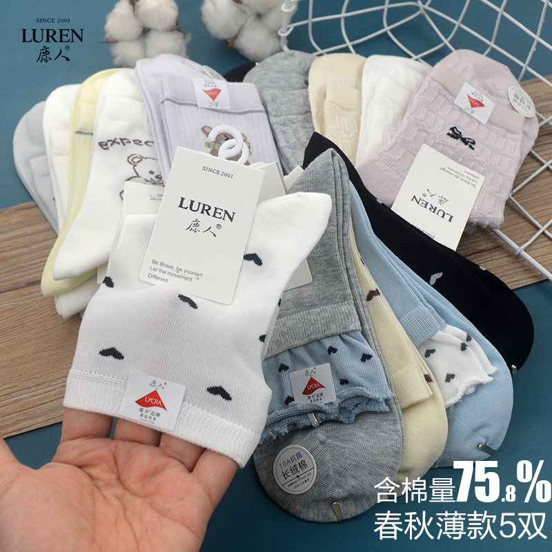 鹿人女袜春夏长绒棉无骨短筒船袜春秋精梳棉袜抗菌透气学生袜3002