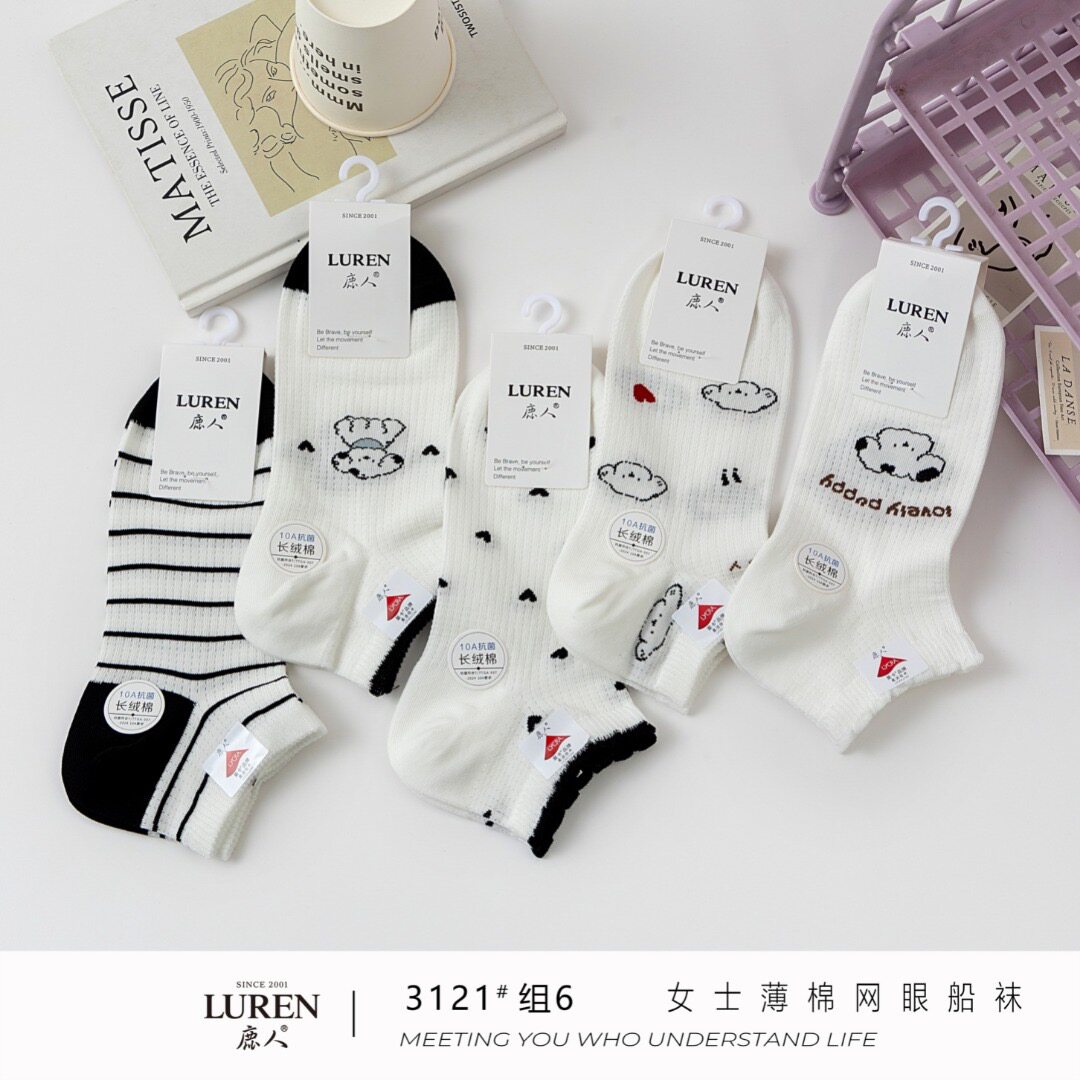 鹿人袜子夏季女薄款船袜5A抗菌纯棉双针短袜舒张圈网眼短袜3512