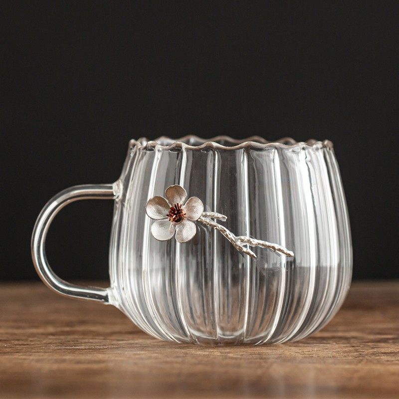 馨玉坊透明竖纹花瓣杯玻璃杯带把泡茶喝茶创意办公室家用花茶茶杯