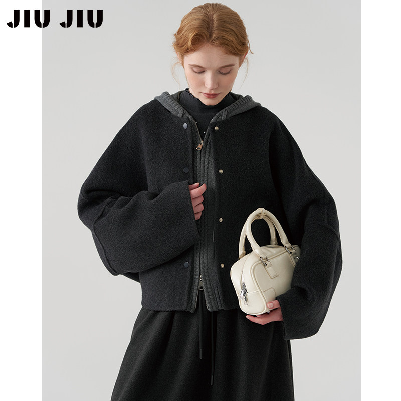 JIUJIU两件套休闲针织拼接羊毛大衣女短款冬季设计感双面呢外套