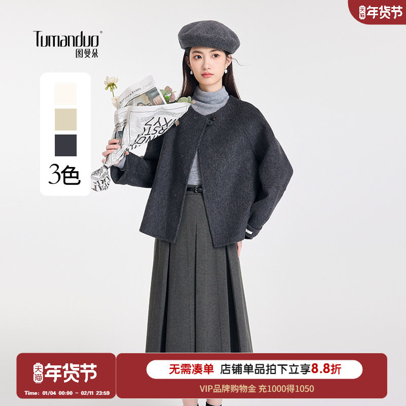 图曼朵深灰色双面呢羊毛大衣女短款冬韩版宽松圆领小香风毛呢外套