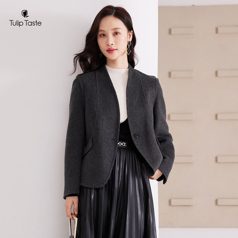 郁香菲简约双面呢大衣女短款冬季通勤时尚无领修身一粒扣毛呢外套