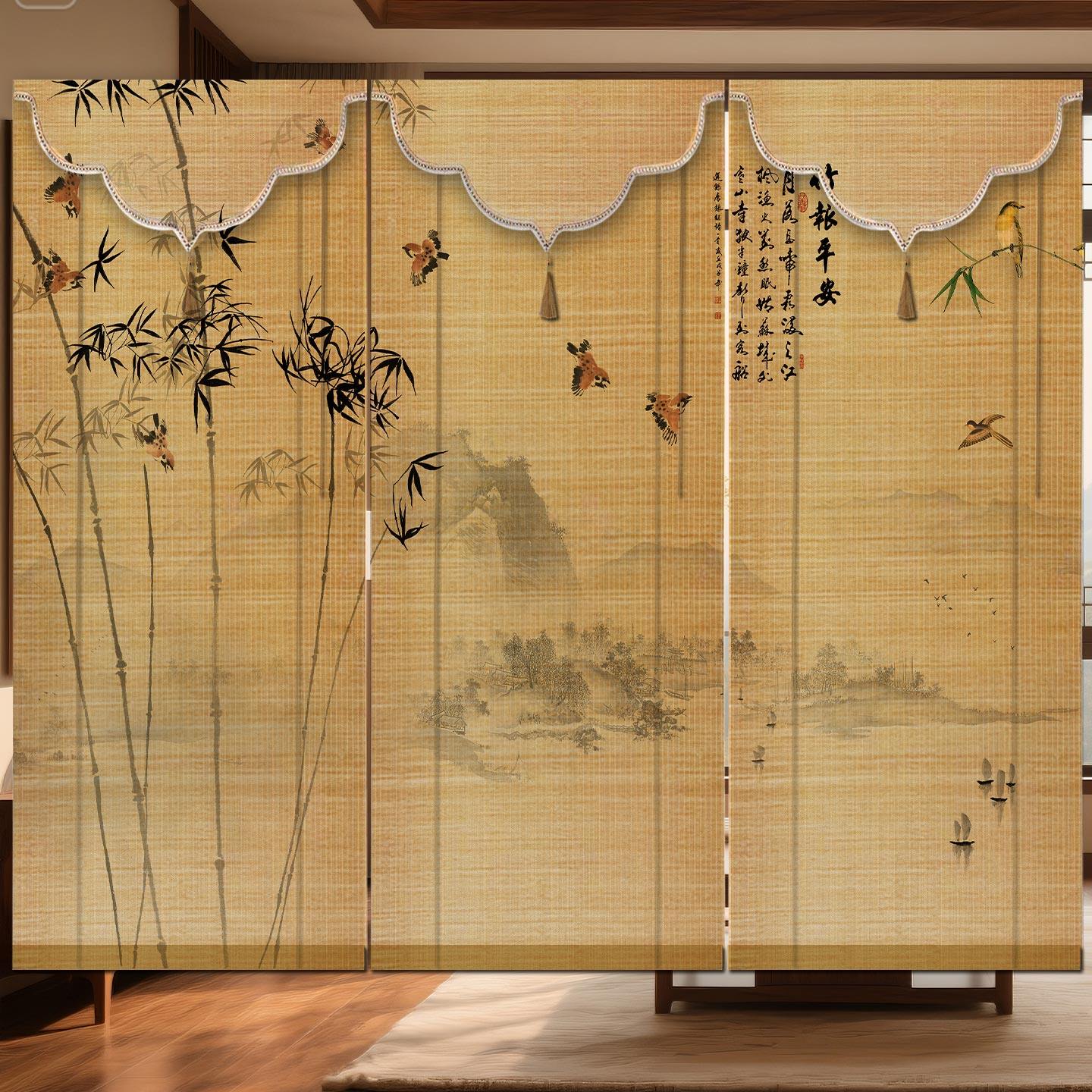 印花竹帘卷帘茶室隔断门帘新中式遮光遮阳国风背景墙装饰挂画窗帘