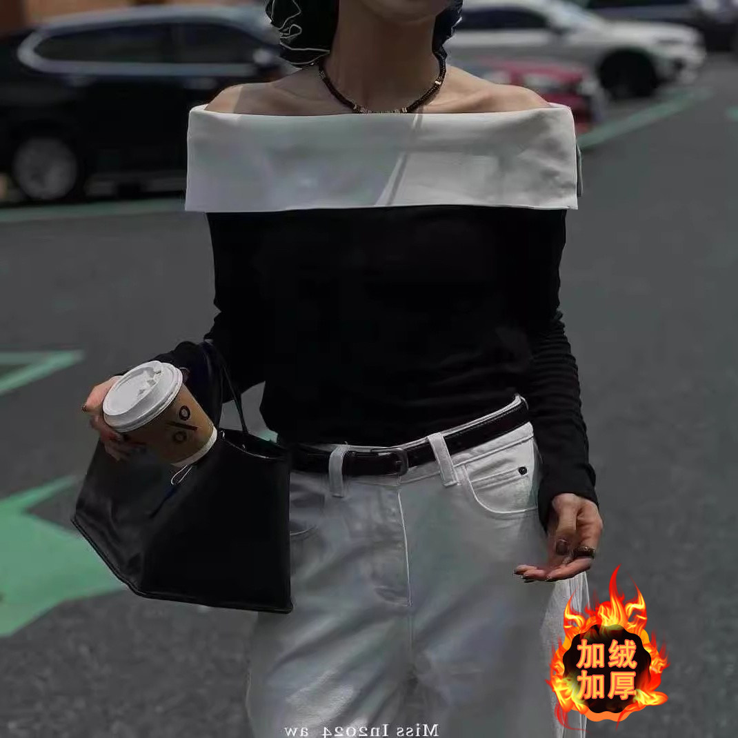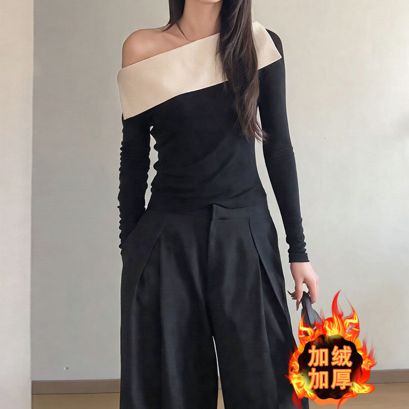 法式黑色加绒打底衫女长袖春秋新款时尚斜肩T恤撞色气质内搭上衣