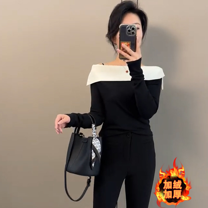 黑色加绒打底衫女长袖春秋款撞色时尚洋气小衫T恤一字领内搭上衣