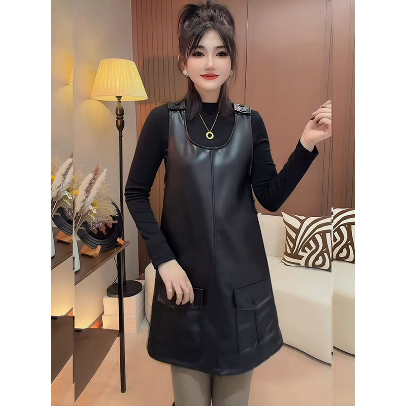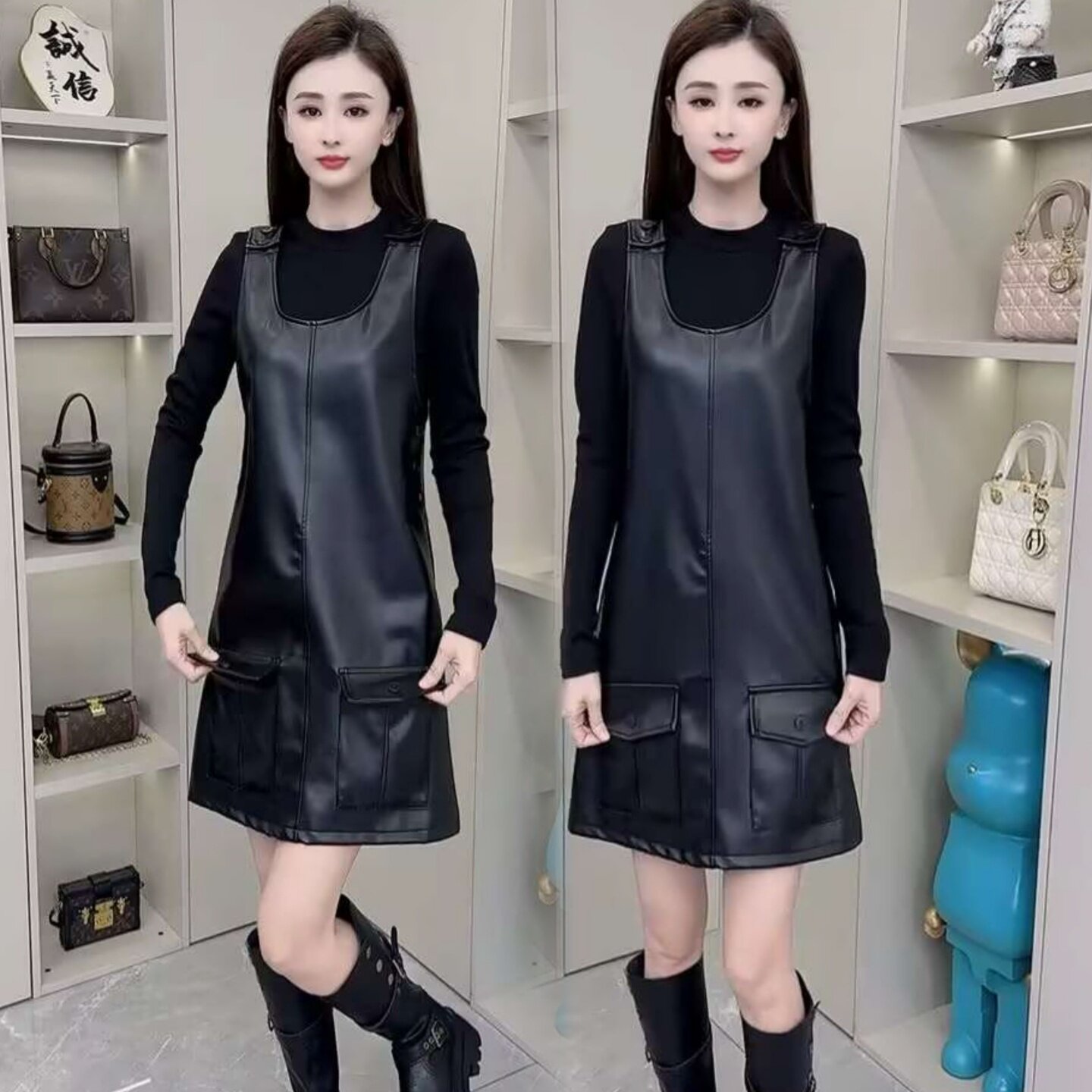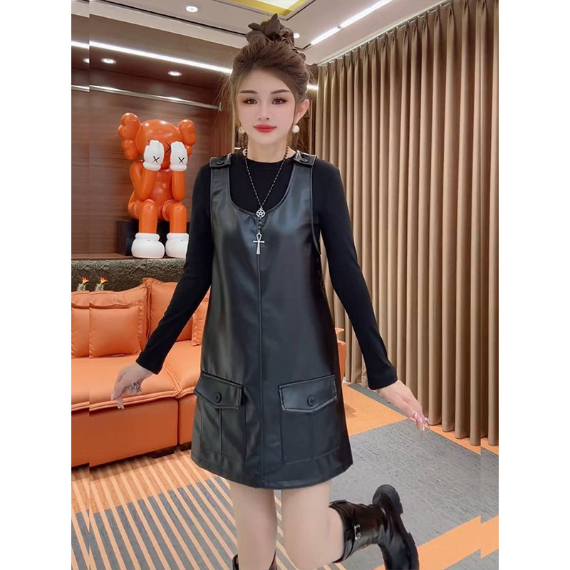 pu吊带皮裙黑色加绒打底衫两件套2025秋冬新款遮肚显瘦气质套装女