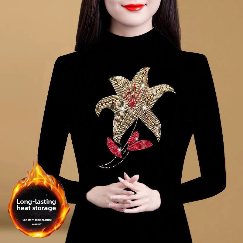黑色加绒打底衫女秋冬装时尚烫钻洋气保暖长袖半高领百搭显瘦上衣