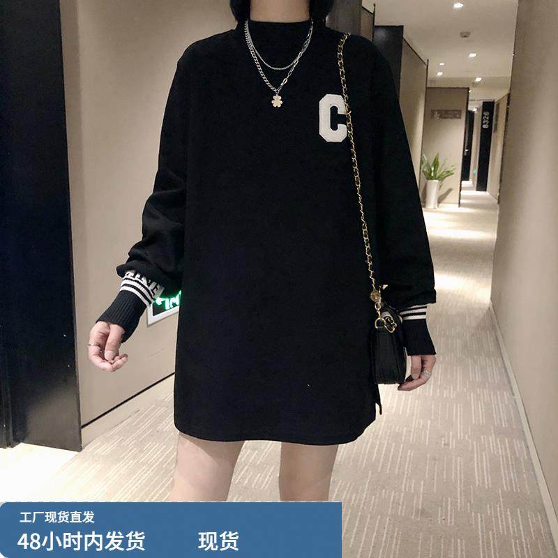 欧货黑色加绒打底衫女秋冬内搭半高领中长款宽松遮屁股长袖t恤ins