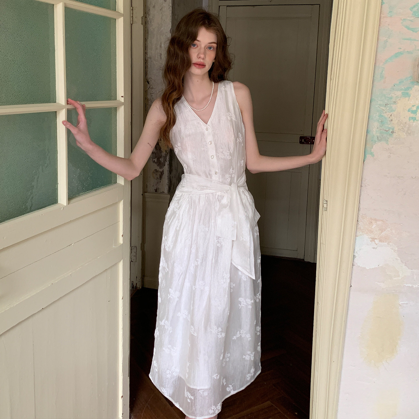 ZHUYIYI 新款法式醋酸白色背心式连衣裙女超仙v领长裙原创设计