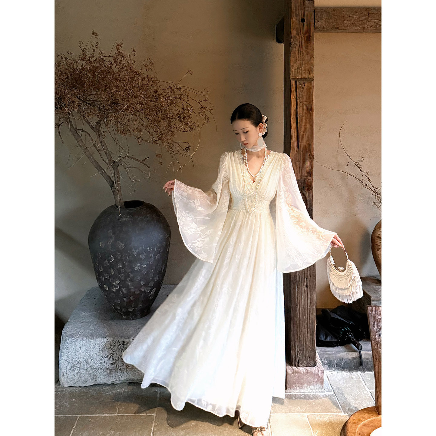 山野逸梦2026年春夏新品《半夏》白色连衣裙女V领收腰蕾丝仙大摆