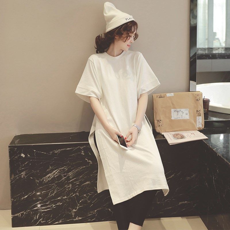 韩国夏季短袖t恤打底裙女纯白色宽松大码中长款个性开叉上衣学生