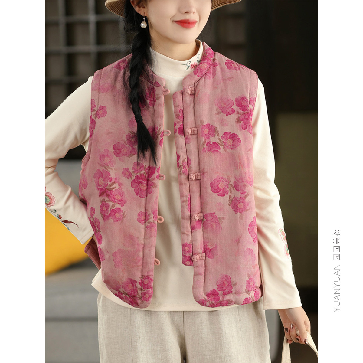 正反两面穿夹棉印花马甲外套女100%棉加厚保暖无袖马夹外搭上衣
