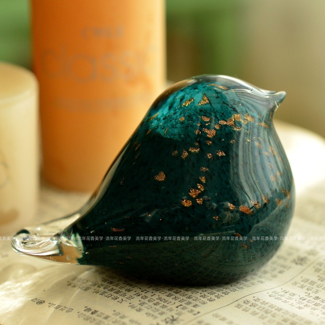 孔雀墨绿色洒金肥嘟嘟胖哒哒可爱纯手工玻璃小鸟摆件拍照摄影道具