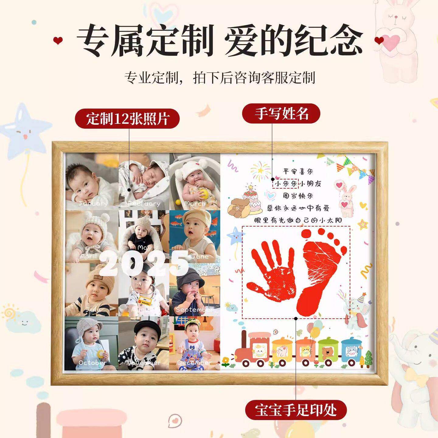 宝宝周岁手足印宝宝相框木质定制纪念12张照片专属仪式感抓周布置