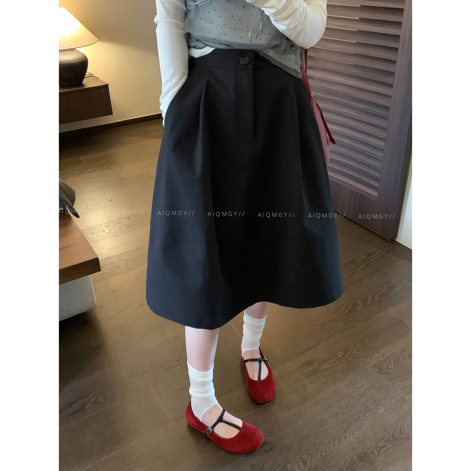 pusumede 黑色高腰半身裙女中长款休闲韩系气质裙子百搭a字伞裙