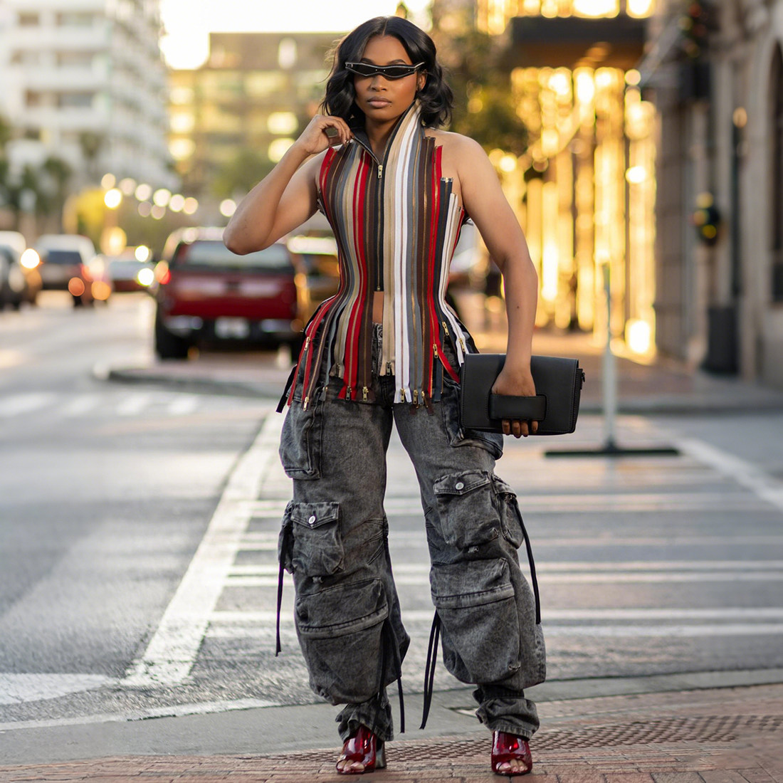 #Sisjuly#小众时尚街拍达人 炫彩不规则拉链拼接露背性感背心女秋
