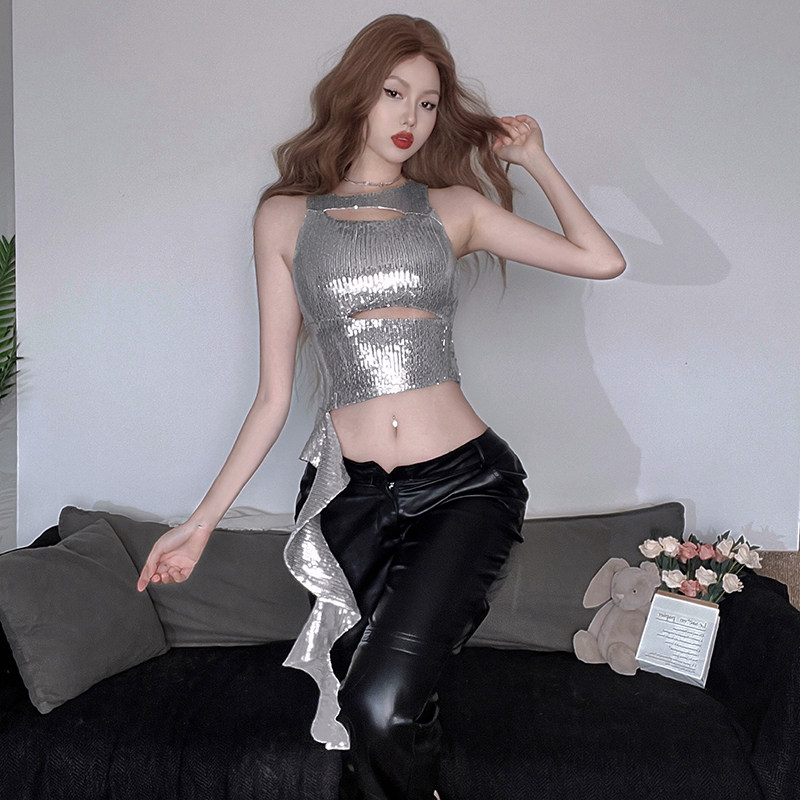 SylCue氛围感辣妹亮片性感背心女纯欲修身露脐镂空不规则短款上衣