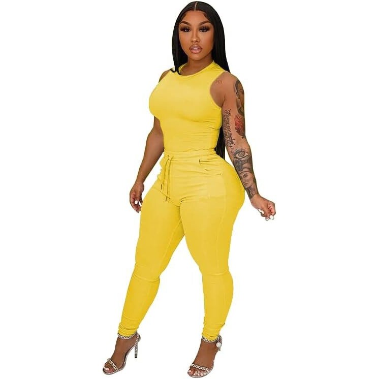欧美亚马逊跨境性感背心女士外贸休闲长裤腰带系绳两件套运动套装