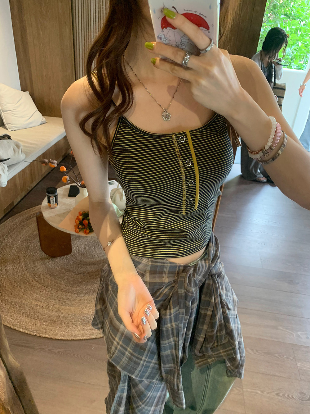 荒荒家 黄条纹带胸垫吊带2025新款小众撞色露脐纯欲性感背心女夏