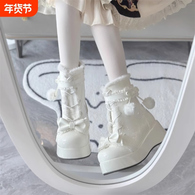 秋冬新款lolita鞋子厚底松糕跟甜美软妹靴子可爱软萌毛球洛丽塔鞋