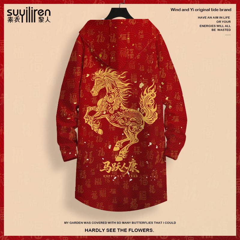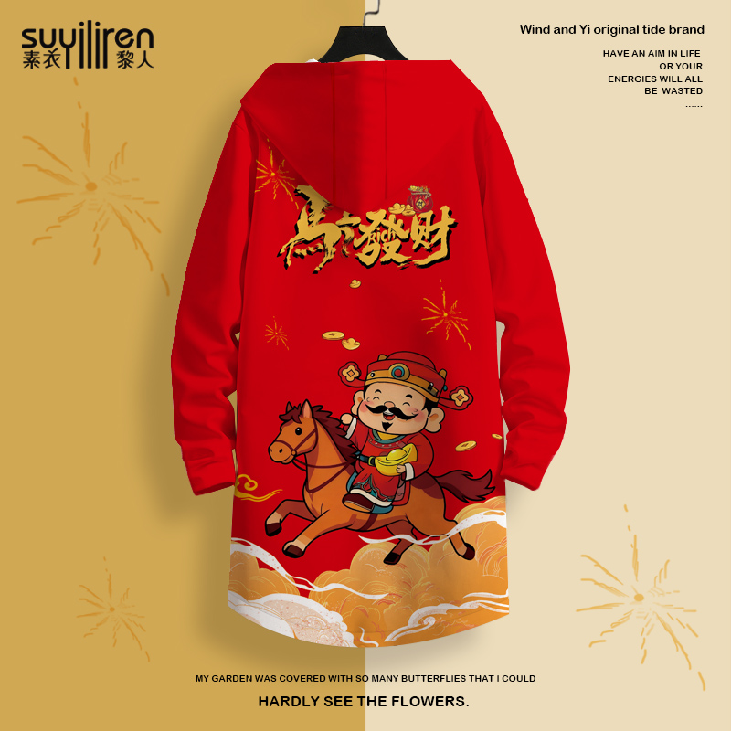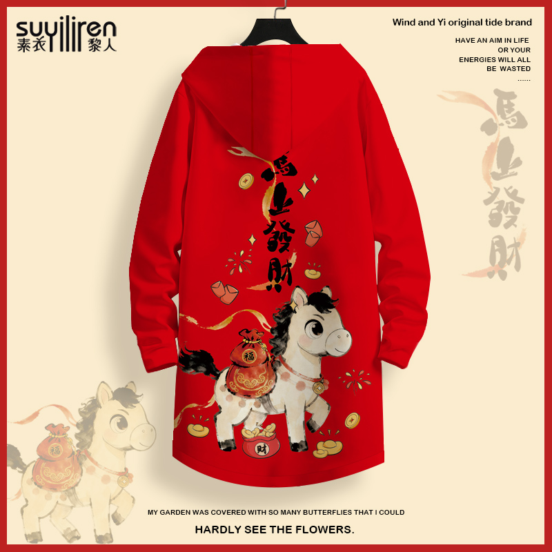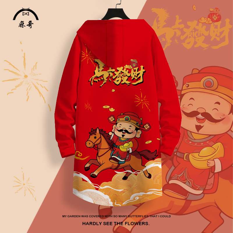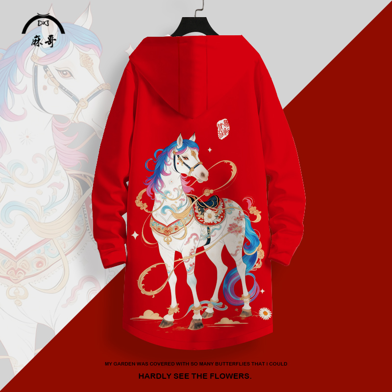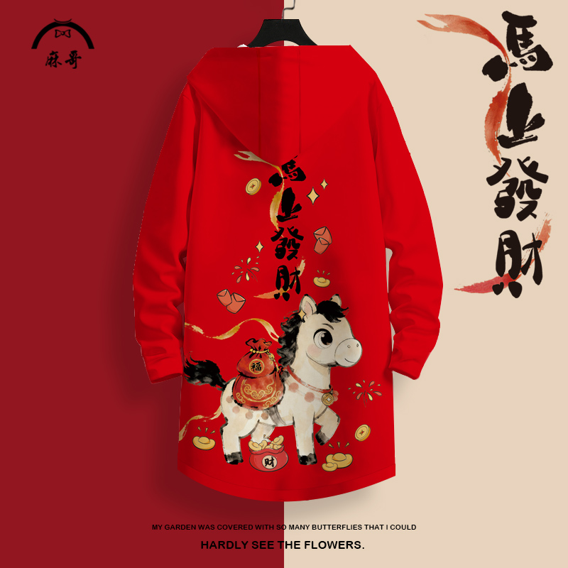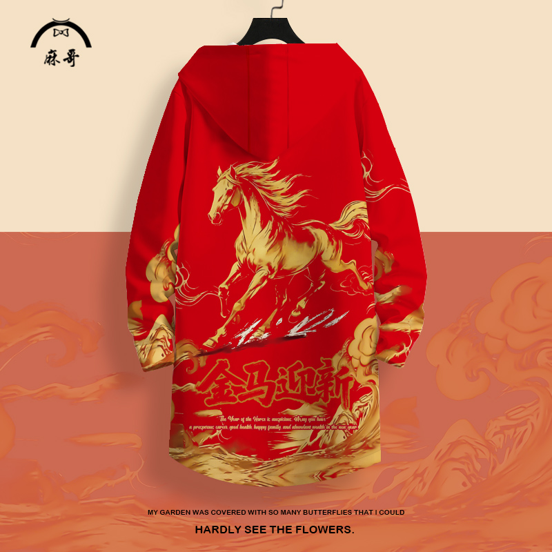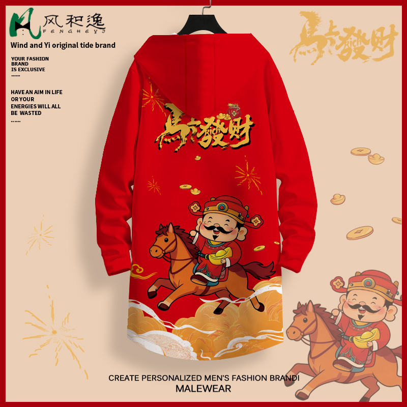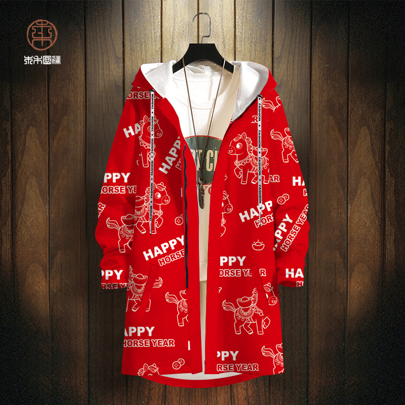 国潮风衣外套男士马年本命年红色中长款连帽大衣oversize加厚开衫