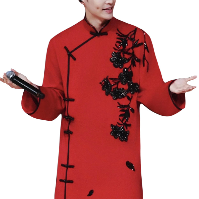 ROKKIHU 新中式红色盘扣大衣男黑亮片刺绣国风长款舞台主持外套