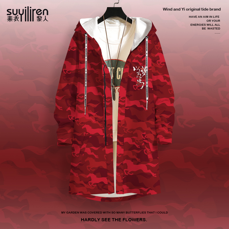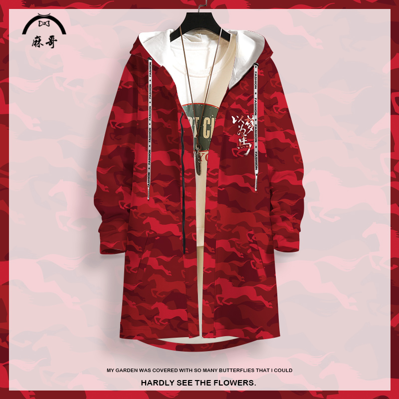 中长款风衣外套男士ins国潮马年本命年红色连帽大衣大码加肥开衫