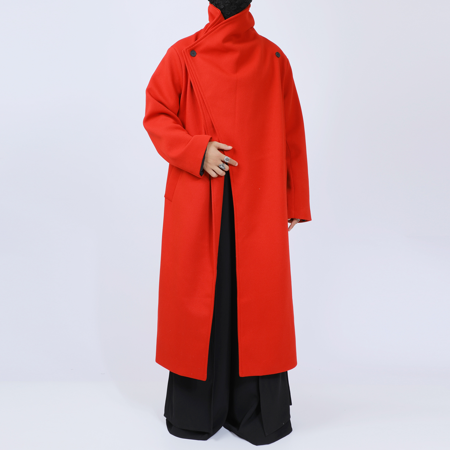 原创男装秋冬毛呢大衣红色小众设计感大翻领长款过膝呢风衣外套潮