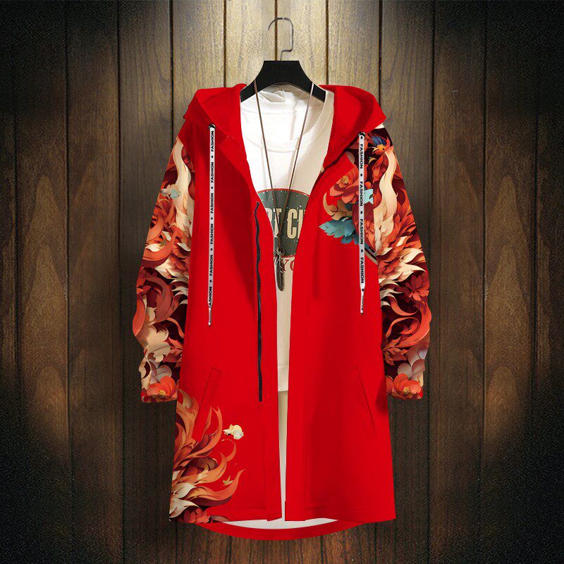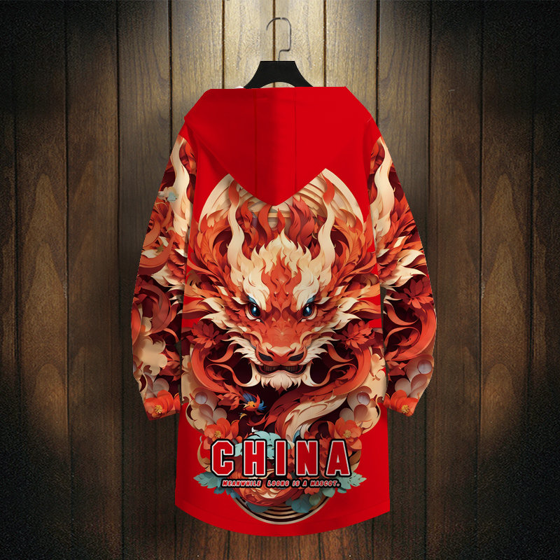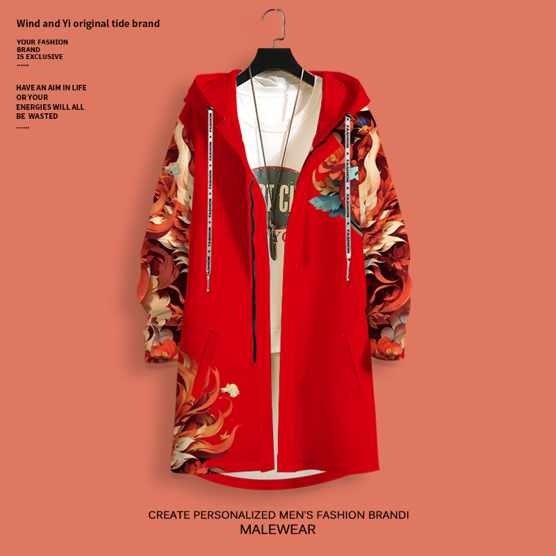 国风风衣外套男生龙年本命年红色中长版连帽开衫冬季加厚防风大衣