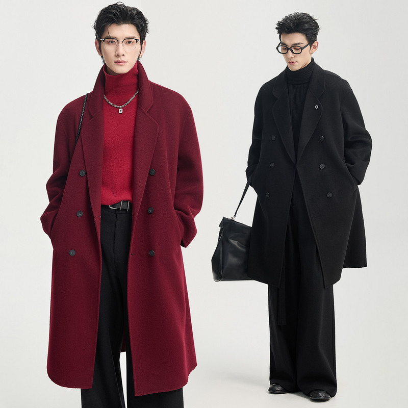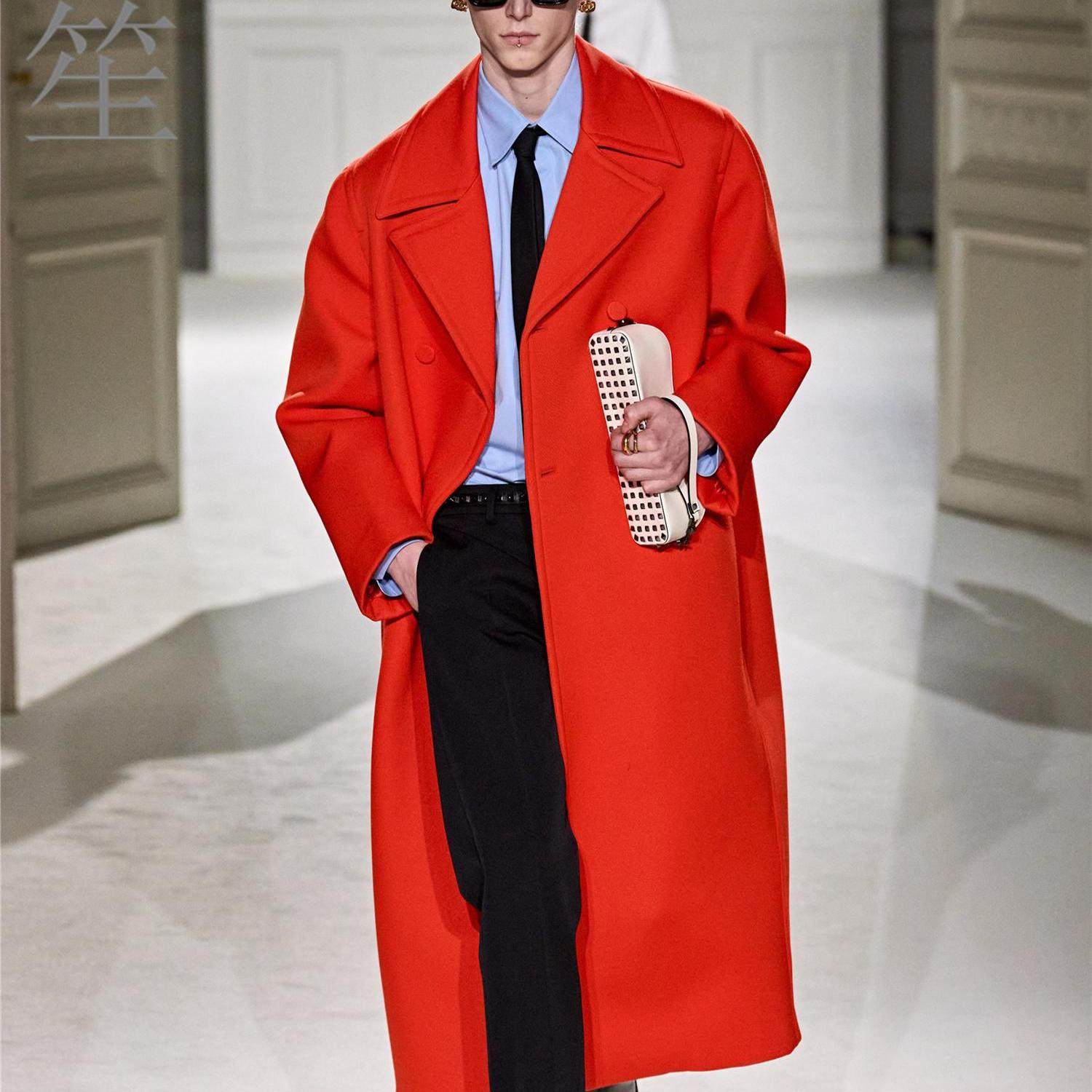 秋冬红色大翻领长款过膝毛呢大衣外套男廓形复古风衣开衩气质上衣