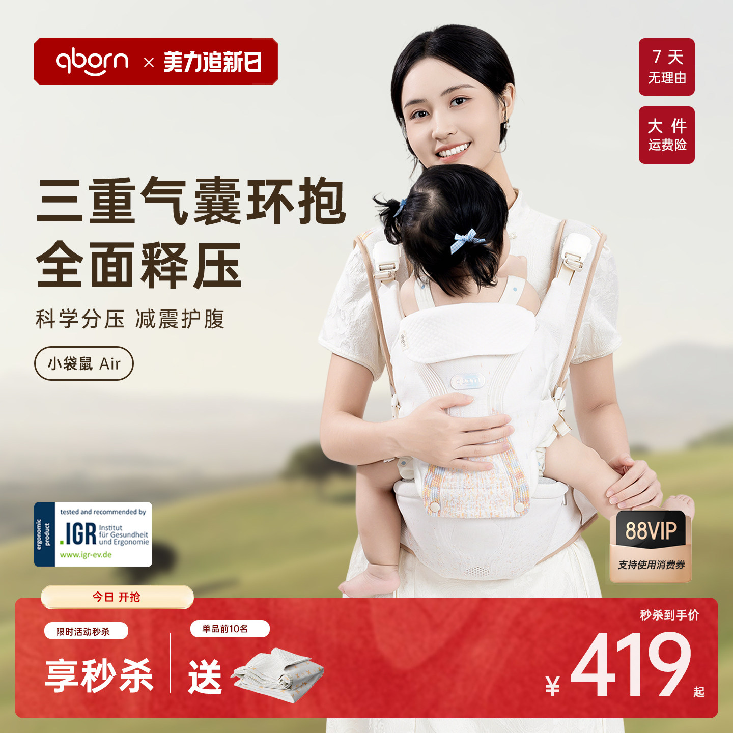 qborn小袋鼠Air婴儿小月龄护腰宝宝腰凳背带二合一多功能抱娃神器