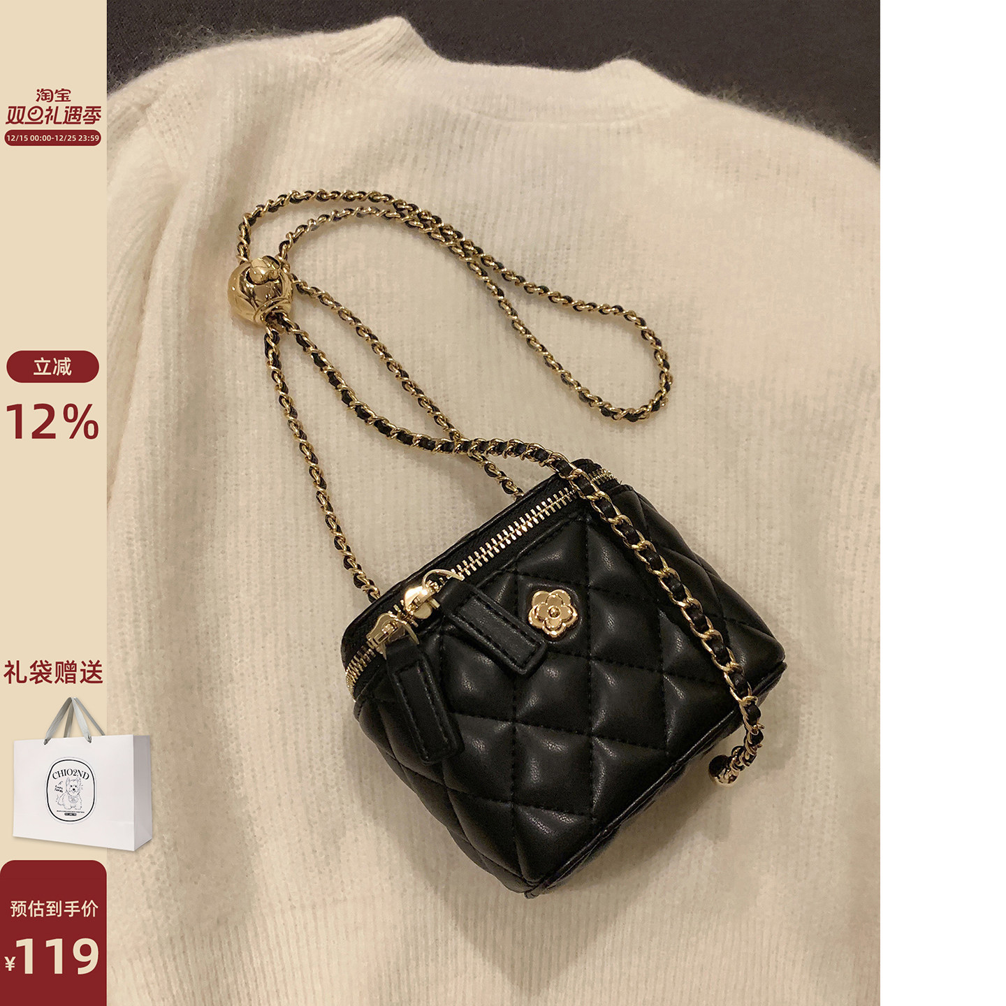 Mankok菱格小金球链条包女新款迷你手提盒子包百搭轻奢单肩斜挎包
