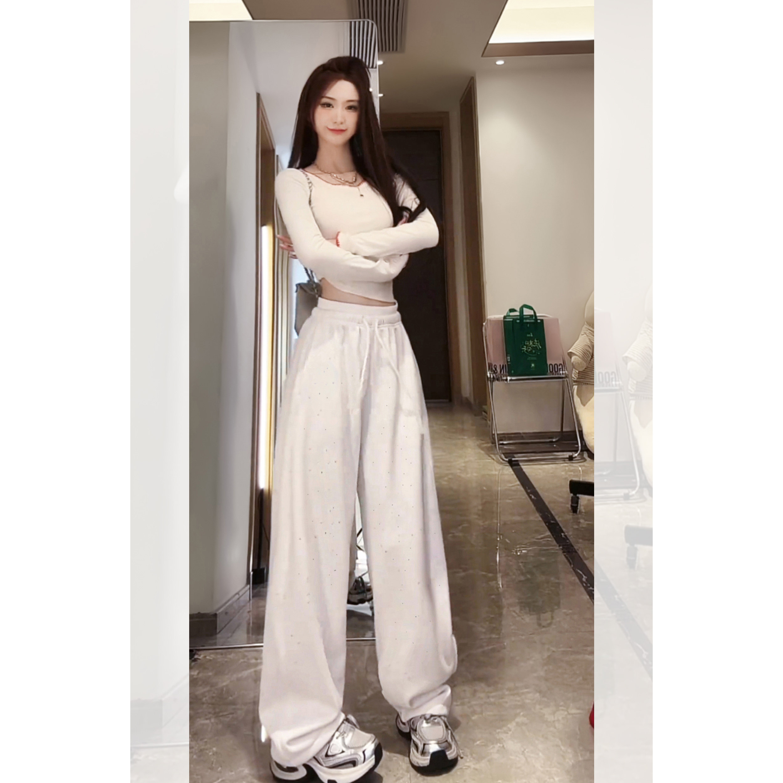 拼接腰白色阔腿裤秋冬加绒加厚2026新款满天星亮片设计感休闲裤
