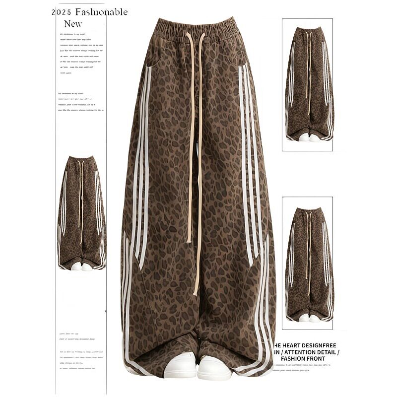 大码胖mm美式复古豹纹三条杠拼接阔腿裤秋冬新款显瘦直筒休闲裤子
